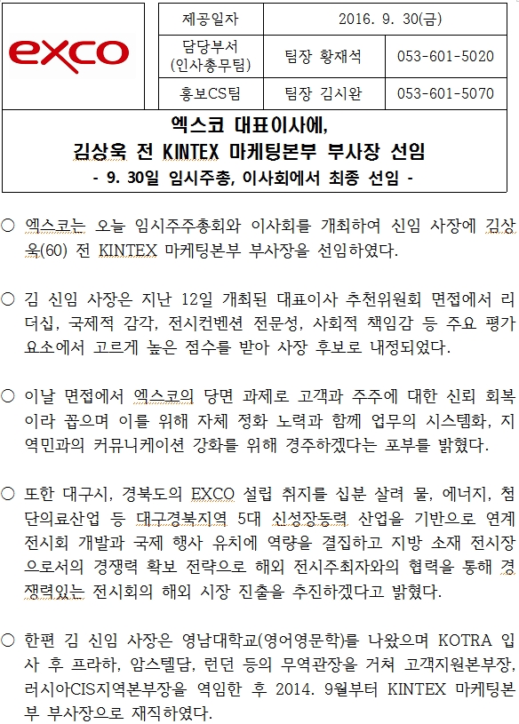 | 제목 | (엑스코) 김상욱 전 KINTEX 마케팅본부 부사장 선임 |