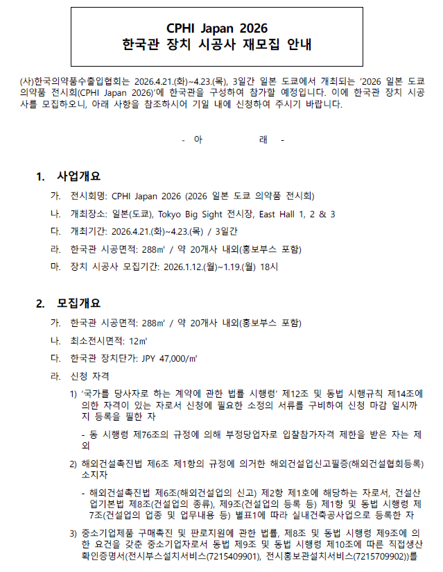 | 제목 | [한국의약품수출입협회] CPHI Japan 2026 한국관 장치 시공사 재모집 안내 |