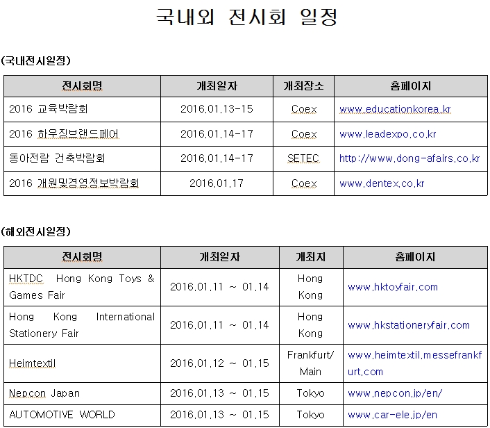 | 제목 | [안내](진흥회) 2016년 1월 2주 전시회 일정 안내 |