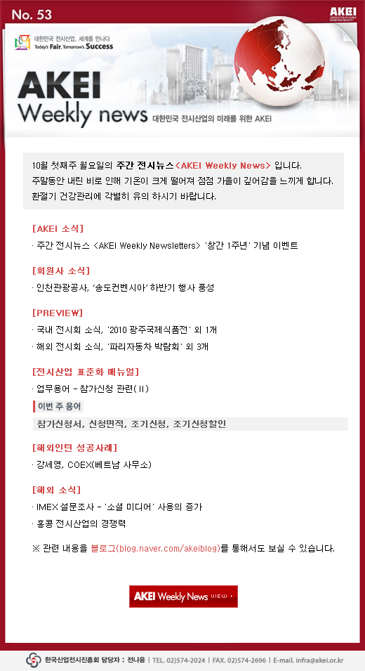 - 다음글[안내](진흥회) 주간 전시뉴스 AKEI Weekly Newsletters '창간 1주년' 기념 이벤트 10.10.04