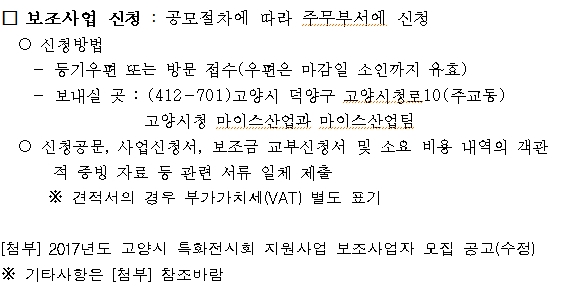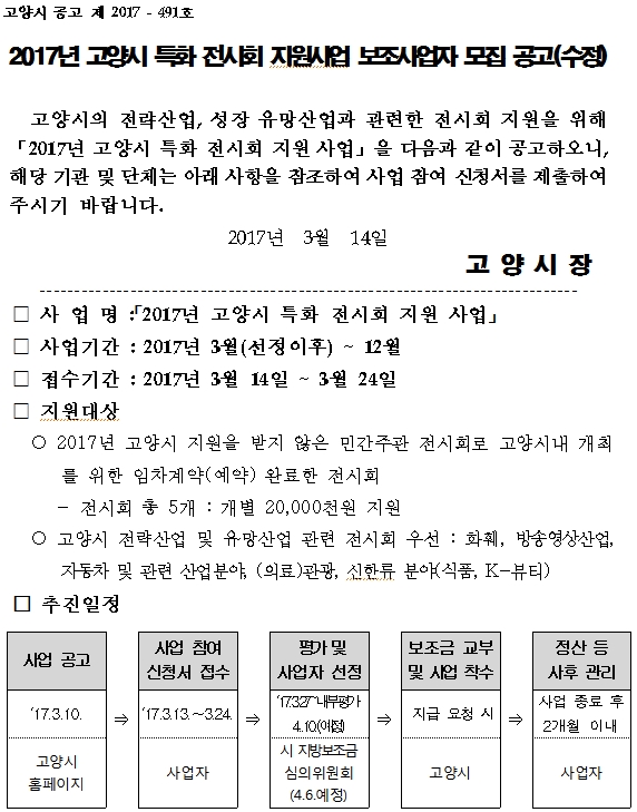 | 제목 | [고양시] 2017년 고양시 특화 전시회 지원사업 보조사업자 모집 공고(수정) |